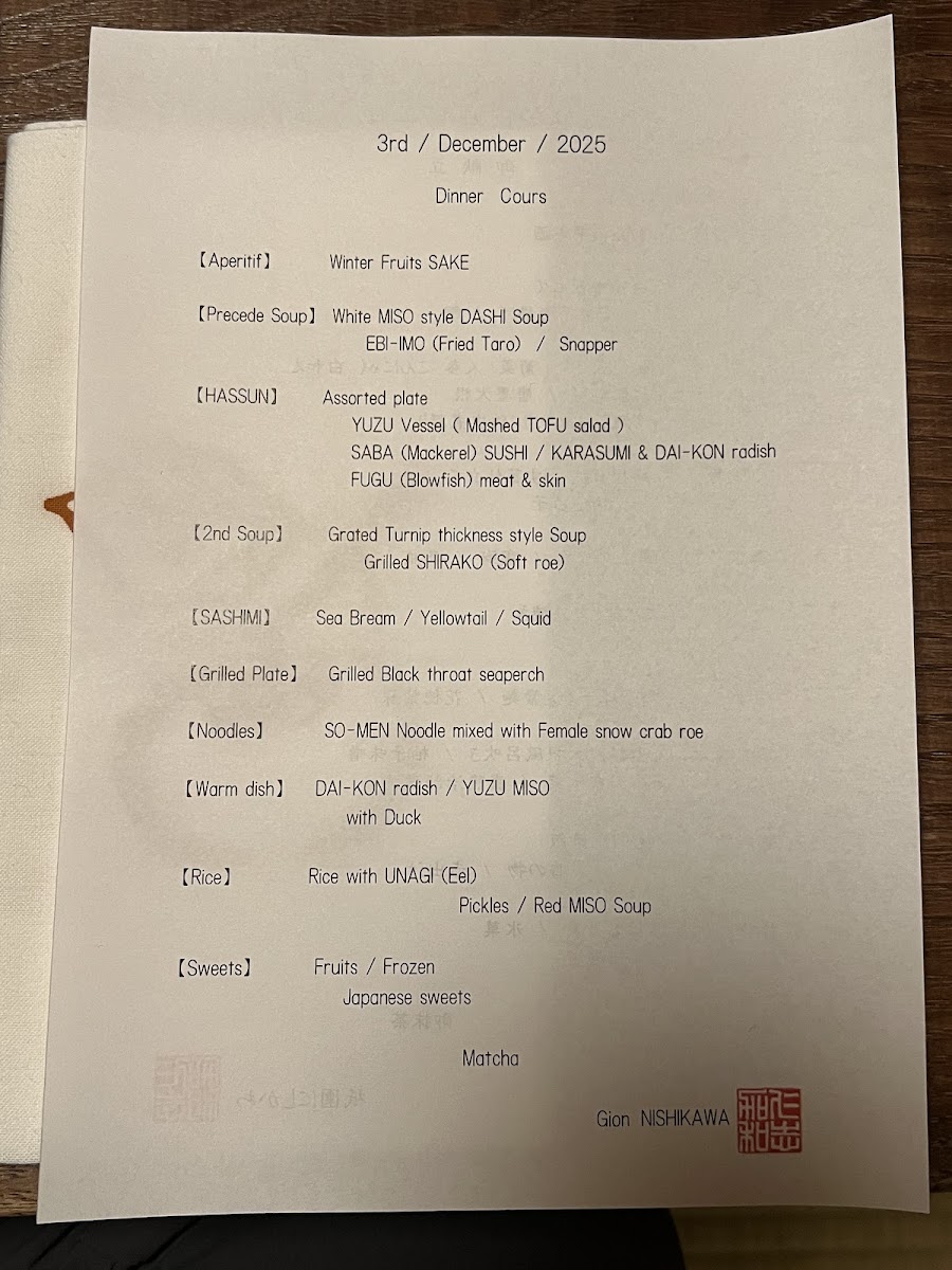 From a reviewer’s perspective, the menu at Gion Nishikawa reflects a refined and traditional approach to Kyoto dining, with a clear focus on seasonal kaiseki cuisine. The highlight of the menu is the beautifully presented お昼の懐石, which showcases a carefully balanced selection of small dishes that emphasize fresh, seasonal ingredients and elegant preparation. Each course in お昼の懐石 is thoughtfully arranged, offering a harmonious progression of flavors, textures, and visual presentation that embodies the essence of fine Japanese dining. Overall, the menu may appear simple at first glance, but the depth, craftsmanship, and seasonal sensitivity behind お昼の懐石 make it a memorable culinary experience that reflects the restaurant’s dedication to traditional kaiseki artistry.